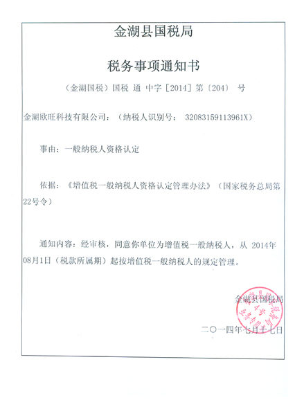 • 一般納稅人認(rèn)定稅務(wù)通知書